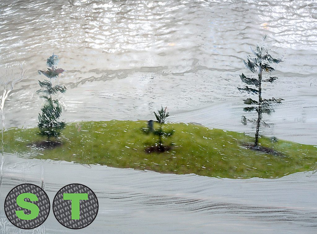 Autot liikkuvat maalatun pinnan takana. Pinnan takaa paljastuu raaputtamalla liikenteenjakaja, jossa kasvaa pieniä mäntyjä. Raitiovaunut ja ihmiset kulkevat ohi. Liikenteenjakaja on outo kappale kaupunkiluontoa.