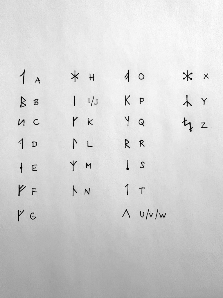 Kirjoita oma nimesi riimukirjaimilla. Käytä apuna mallia: